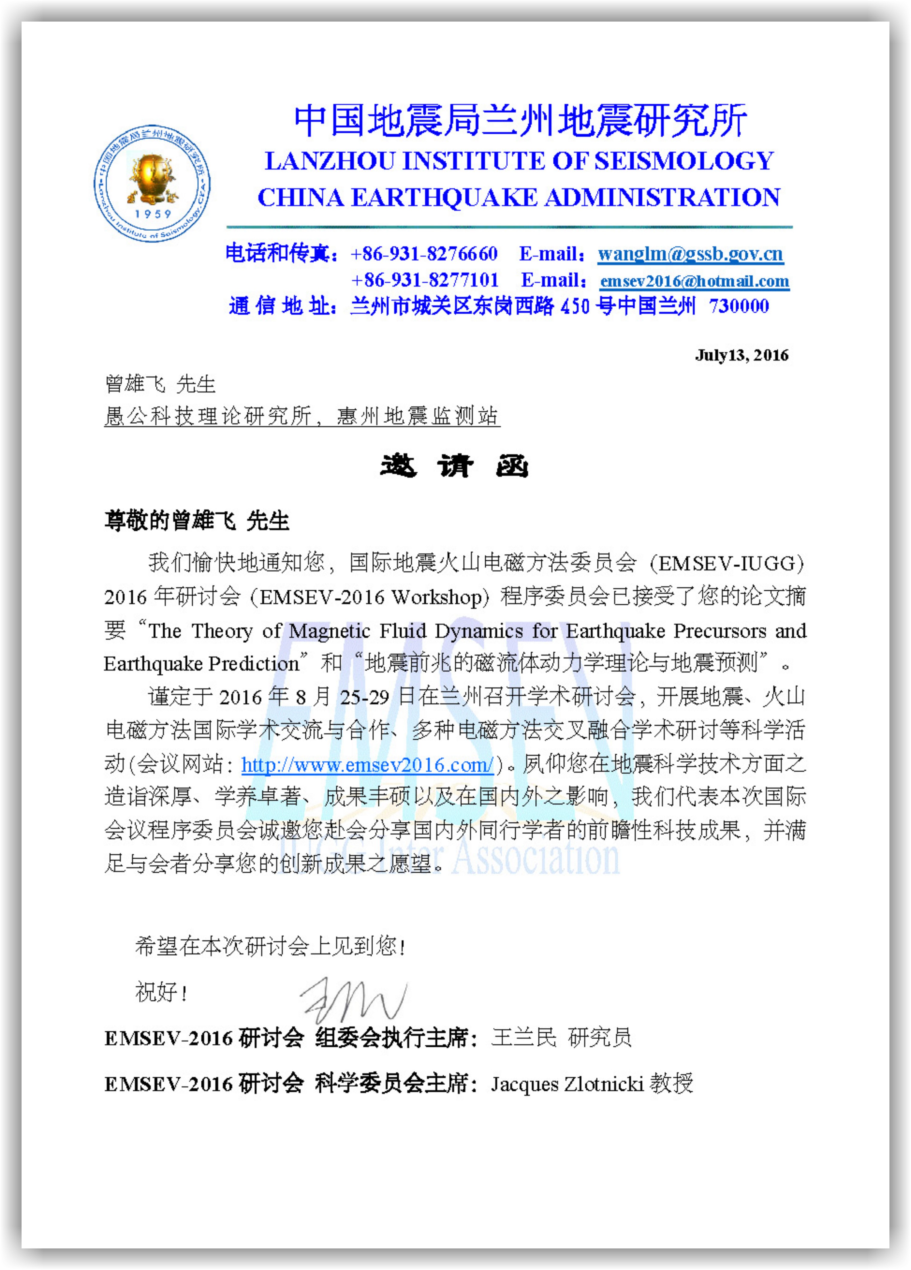 至于地震研究,曾雄飞花了八年时间,自筹资金进行攻关,终于建立了地震和地震预测预报基础理论,地震预测已经放在了严格的物理定律的基础上。EMSEV-2016兰州国际研讨会,会议执行主席王兰民和科学委员会主席Zlotnicki,亲自签署邀请函向曾雄飞发出邀请: