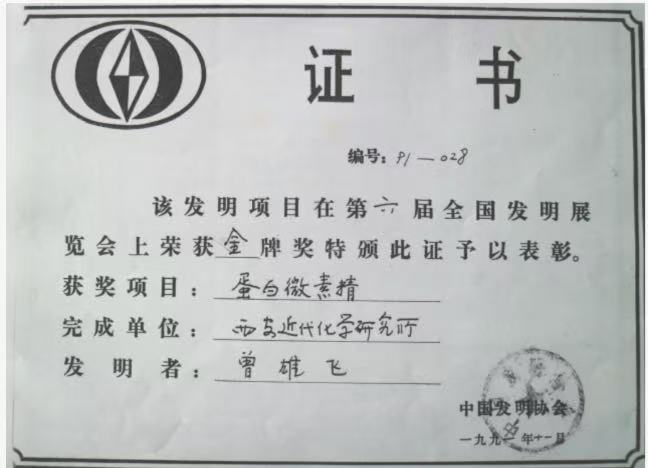 2、蛋白微素精发明金牌奖证书